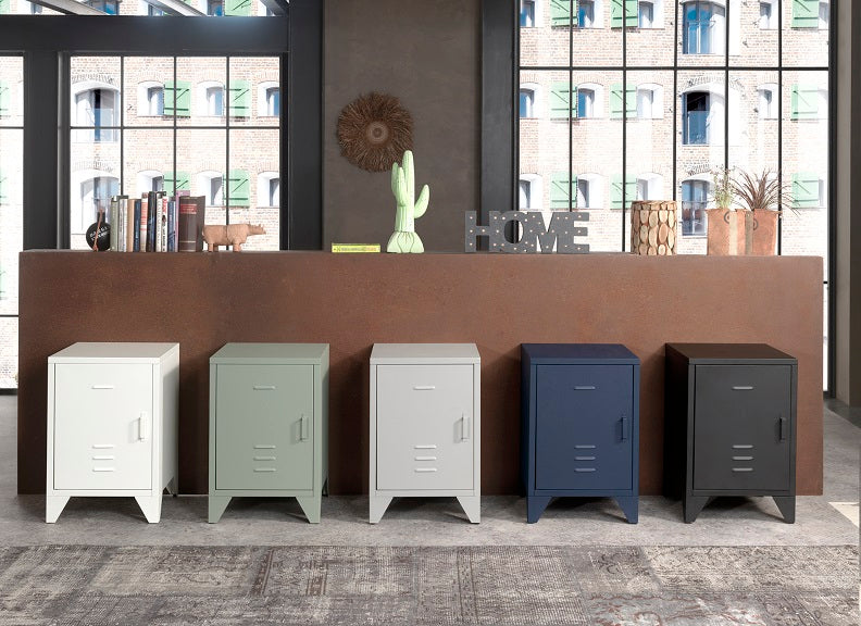 These Bedsides are available in blue, white, grey, black or olive green colours. A similar styled Bronxx Metal Bed is also available.