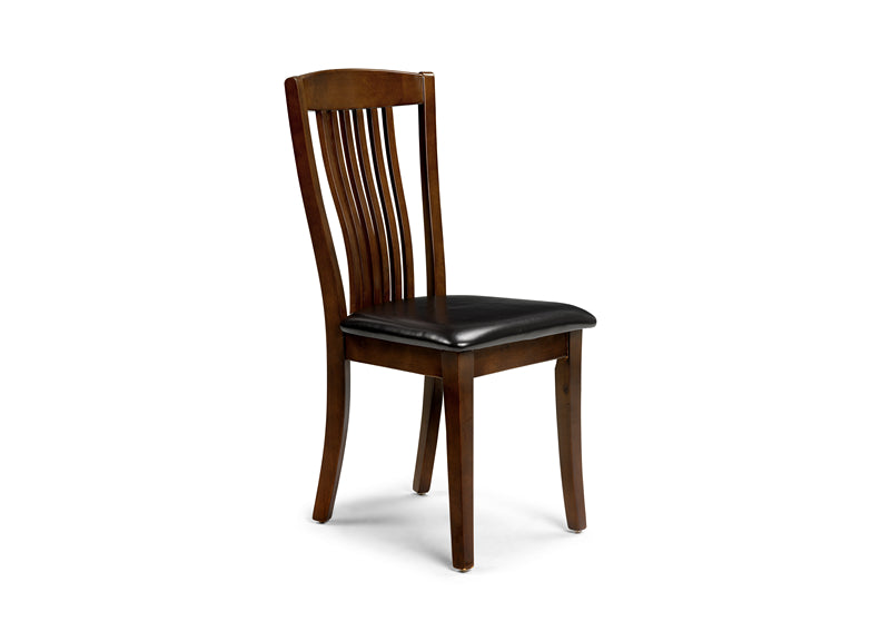 The Canterbury Dining Chair - a tropical hardwood frame in a mahogany lacquered finish with as faux leather seat. Use with the similar styled Canterbury Dining Tables or any dark wood table.