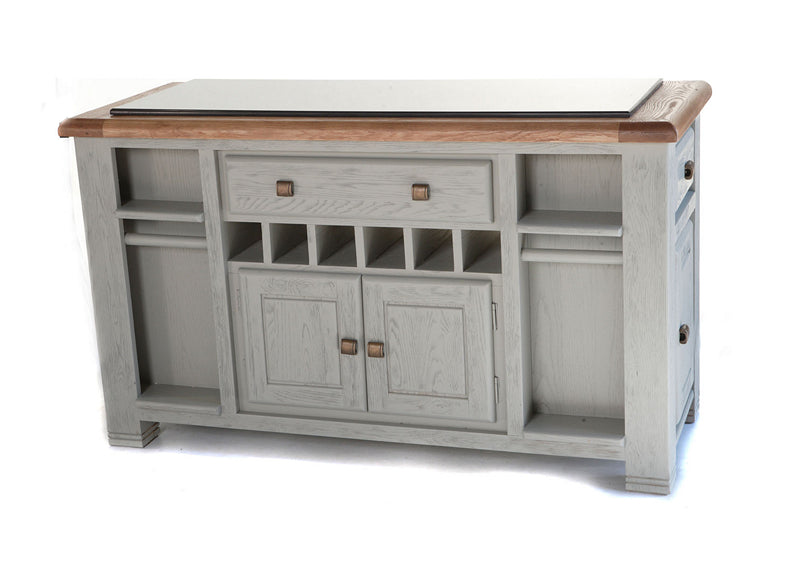 Danube Grey & Oak Large Kitchen Island, with wine bottle bays, stone effect top, cupboards, hanging rails & drawers.