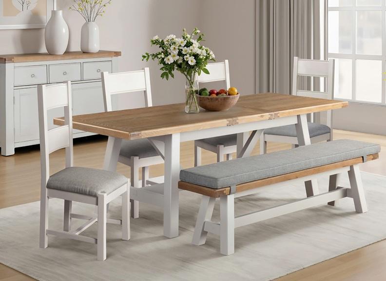 Available as a 1.2/1.65 extending table, 1.4/1.8 extending table, 1.8/2.4 extending table or as a cross style 1.9/2.35 refectory extending table.