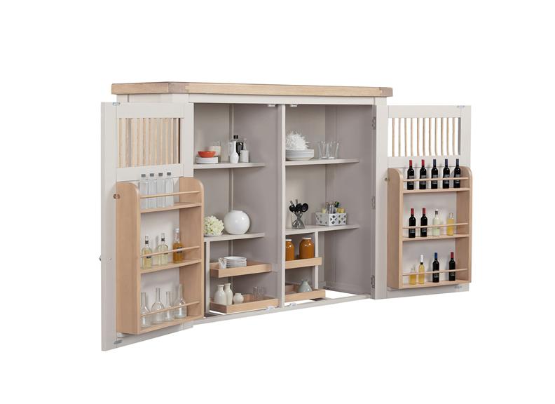DOUNE LARDER HUTCH TOP with taupe lacquered frame, oak effect top, two doors and three drawers.