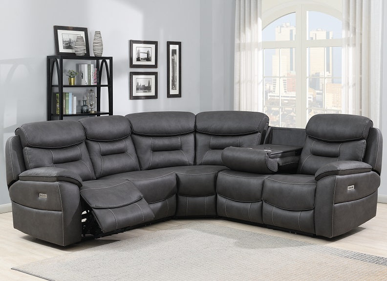 LEROY POWERED SECTIONAL SOFA-with electric footrests(at ends), drop down tray with beverage holders, cosy soft faux suede upholstery and padded headrests & arms. The Leroy sofa items are designed with user comfort in mind.