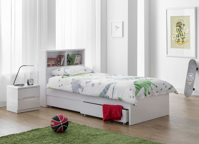 Manhattan Bookcase Bed is an ultra modern chic 3 ft bed with a white high gloss 'easy clean' lacquered surface and integrated shelving giving it a clean contemporary look. This bed has a slatted base for maximum user comfort.