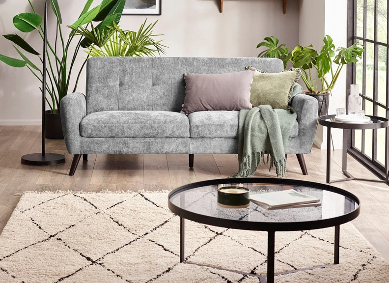 Monza Fixed Three Seat Sofas - with a retro chic Scandinavia design in blue or grey linen type fabric or grey velvet fabric upholstery. Like all items in the Monza Sofa Collection these all have super soft seats.