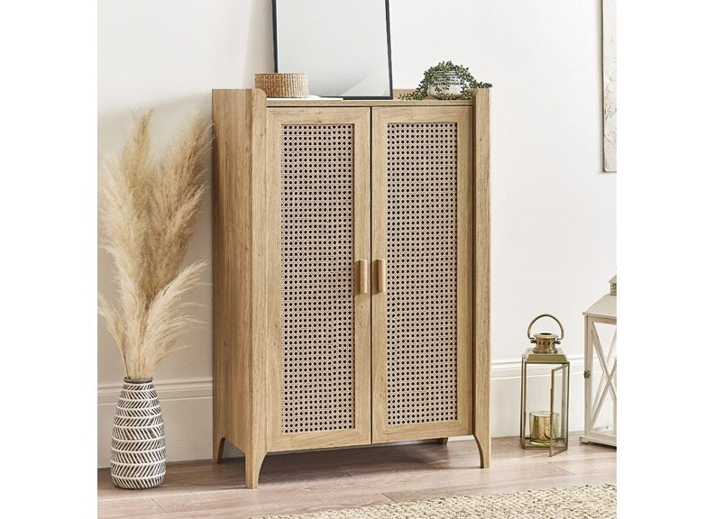 SYDNEY SHOE CUPBOARD with trendy rattan effect frames, internal shelving in an oak finish-to give a stylish warm look to your bedroom.